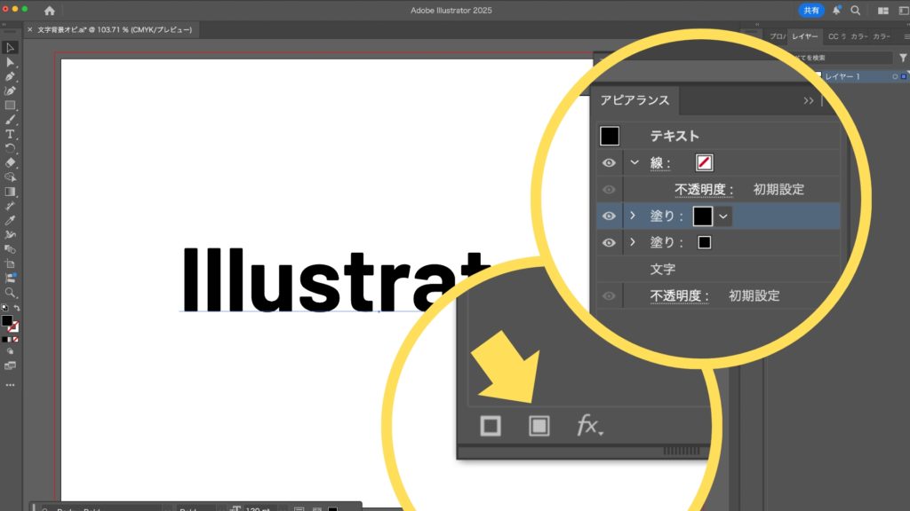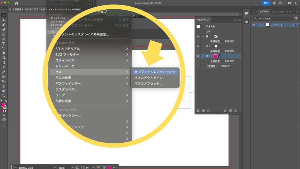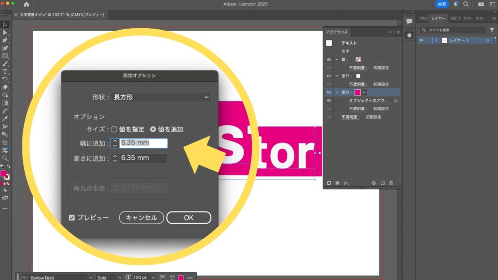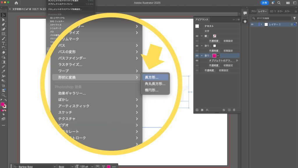2025.07.22 2025.07.24 Application 文字の背景にオビを付ける方法【Illustrator】 kishioka-yasuo 文字ツールを使用して、アートボード上にテキストを入力し、フォントや文字サイズを設定します。 テキストの「塗り」と「線」を「なし」に設定します。 メニューバーから「ウィンドウ」→「アピアランス」を選択し、アピアランスパネルを表示します。 テキストを選択した状態で、アピアランスパネルの左下にある「新規塗りを追加」を2回クリックします。 続いて、「文字」の項目を一番上に移動させます。 追加した2つの塗りにカラーを設定。上の塗りには文字の色、下の塗りにはオビの色を設定します。 「アピアランス」パネルで下の塗りをせ選択した状態から、「効果」メニュー>「パス」>「オブジェクトのアウトライン」を選択します。 下の塗りを選択した状態で、「効果」メニュー>「形状に変換」>「長方形」を選択します。「長方形」の他に、「角丸長方形」「楕円形」を選ぶこともできます。 表示されるパネルから、「サイズ:値を追加」をチェックし、「幅に追加」と「高さに追加」に数値を入力します。 「平面」機能で簡単!奥行きのある3D影付き文字の作り方【Illustrator】 2025.12.18 Application Illustratorでつくる“プラスチック風文字”の作り方 2025.11.30 Application 滑らかで美しい袋文字を作成する方法【Illustrator】 2025.09.08 Application ポップで楽しい!破線を使ったマルチカラー文字の作成法 2025.08.27 Application Illustratorで作る!軽やかな印象の「破線フチ文字」デザイン術 2025.08.15 Application 文字ごとに異なるカラーのフチをつける方法【Illustrator】 2025.08.09 Application アンダーラインの文字を作成する方法【Illustrator】 2025.07.31 Application 文字の背景にオビを付ける方法【Illustrator】 2025.07.22 Application #Illustrator ABOUT ME Yasuo KishiokaWeb DesignerAdobe/Flmora/Canva/STUDIOなどの情報をお伝えするブログです。