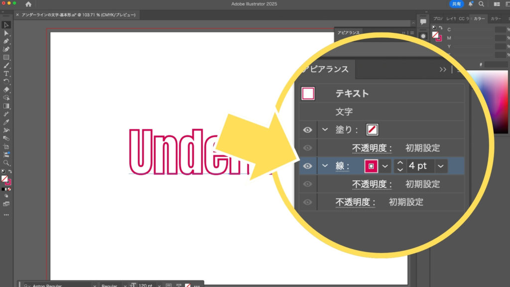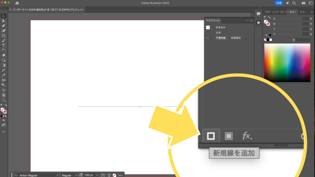 次に、アピアランスパネルにアンダーラインとなる「線」を追加します。