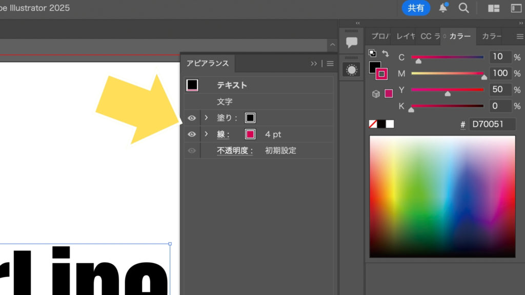 1.新規線の追加: テキストを選択したまま、アピアランスパネルの左下にある「新規線を追加」(四角のアイコン)をクリックします。