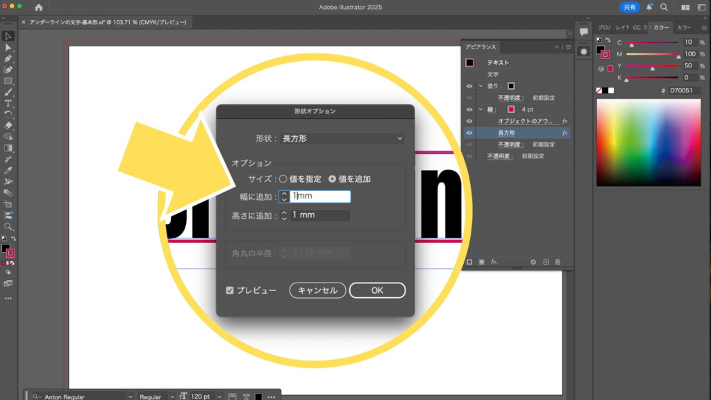 ●表示される形状オプションパネルで、「サイズ」を「値を追加」にチェックを入れ、「幅に追加」と「高さに追加」に数値(例:1mm)を設定します。