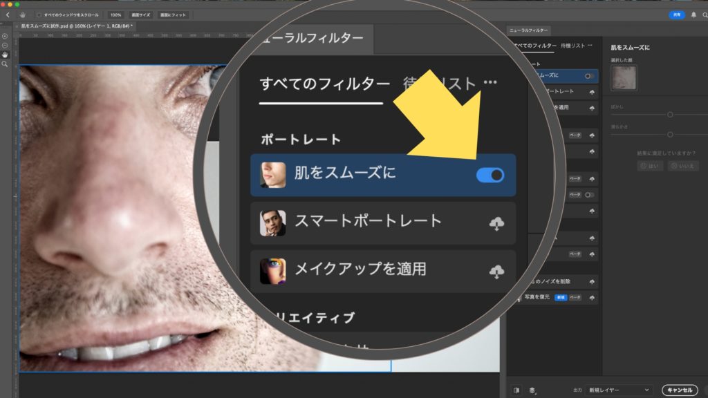 ニューラルフィルターのパネルが表示されたら、一覧の中から「肌をスムーズに」を見つけてボタンをオンにします。
