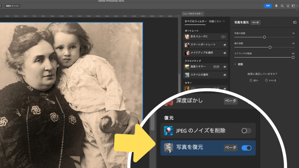 Photoshopの「写真を復元」は、AI(人工知能)技術を駆使して、古い写真の品質を向上させるための機能です。この機能は、ニューラルフィルターの一部として提供されており、写真の傷やノイズの除去、顔の強調、全体的な鮮明化などを自動で行います。特に、損傷が深刻な写真の場合でも、驚くほど自然な修復が期待できます。