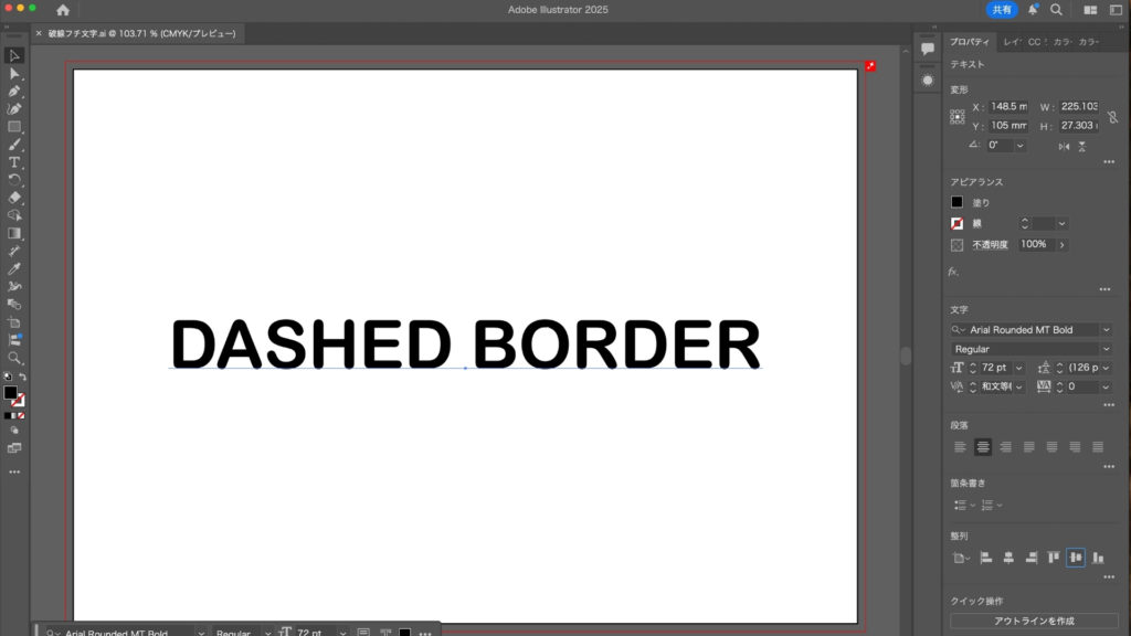 これで、丸いドットで縁取られた「破線フチ文字」が完成です。アピアランスを使えば、元の文字を編集してもデザインが崩れないので、汎用性も抜群。ポスターやバナー、SNS用画像など、さまざまな場面で活用できます。