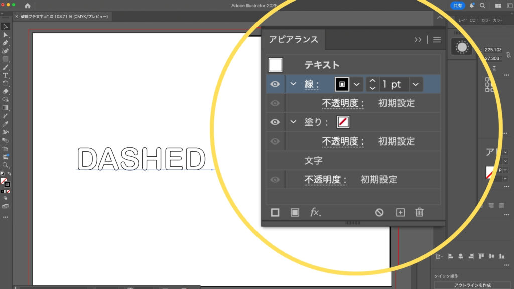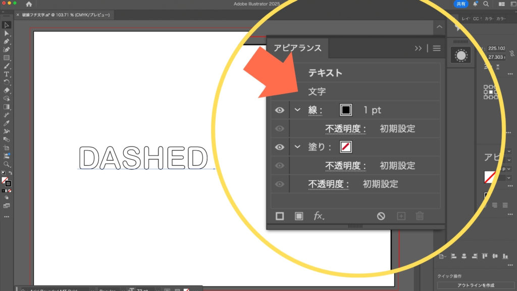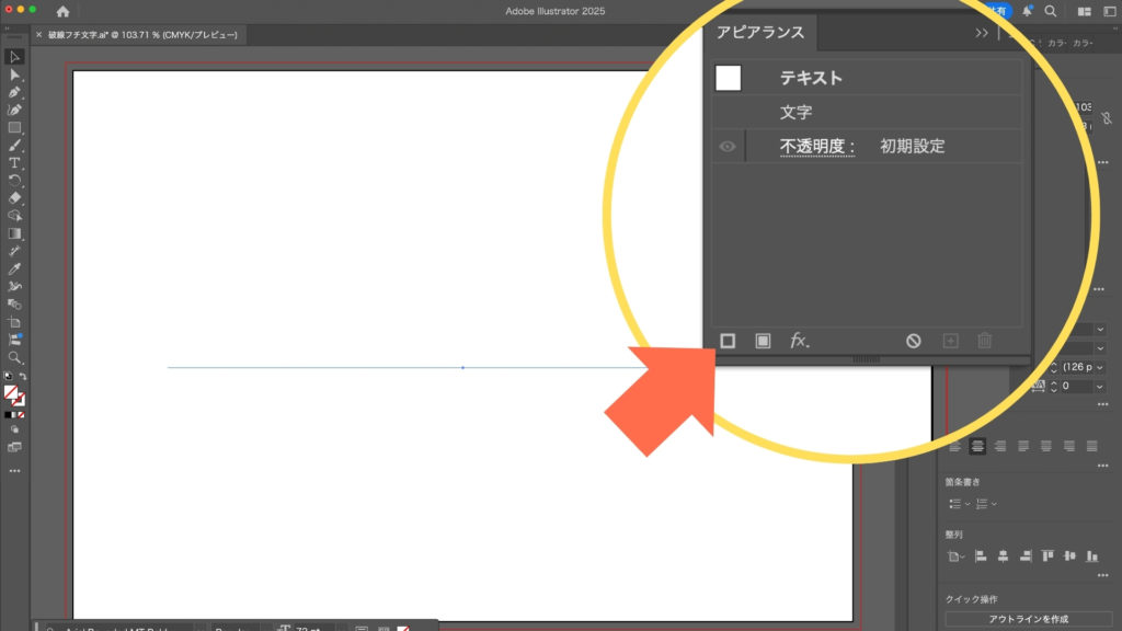 テキストオブジェクトを選択した状態で「アピアランス」パネルを開きます。