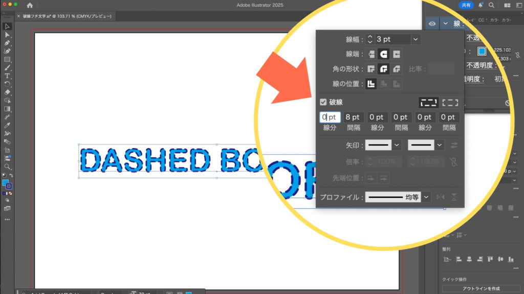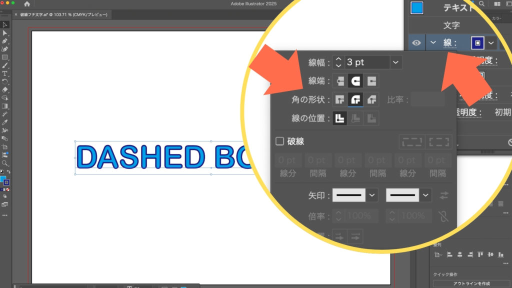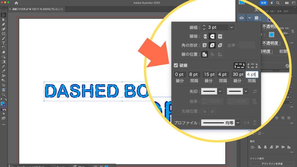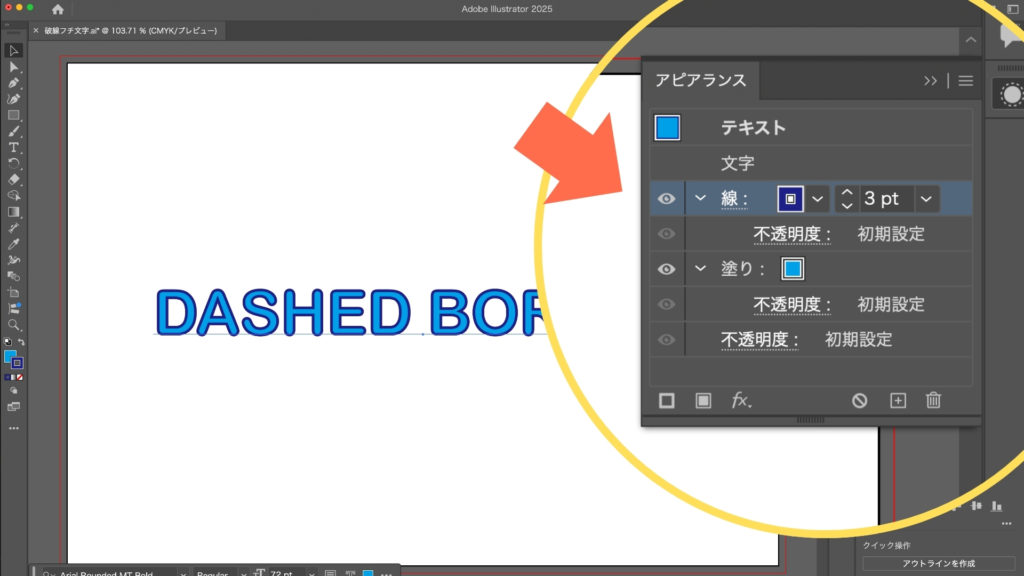 Illustratorでちょっと遊び心のある文字デザインを作りたいときにおすすめなのが、「破線のフチ文字」。丸いドットで縁取られた文字は、軽やかでポップな印象を与えてくれます。今回は、アピアランス機能を使って、破線のしくみを活かしたフチ文字の作り方をご紹介します!