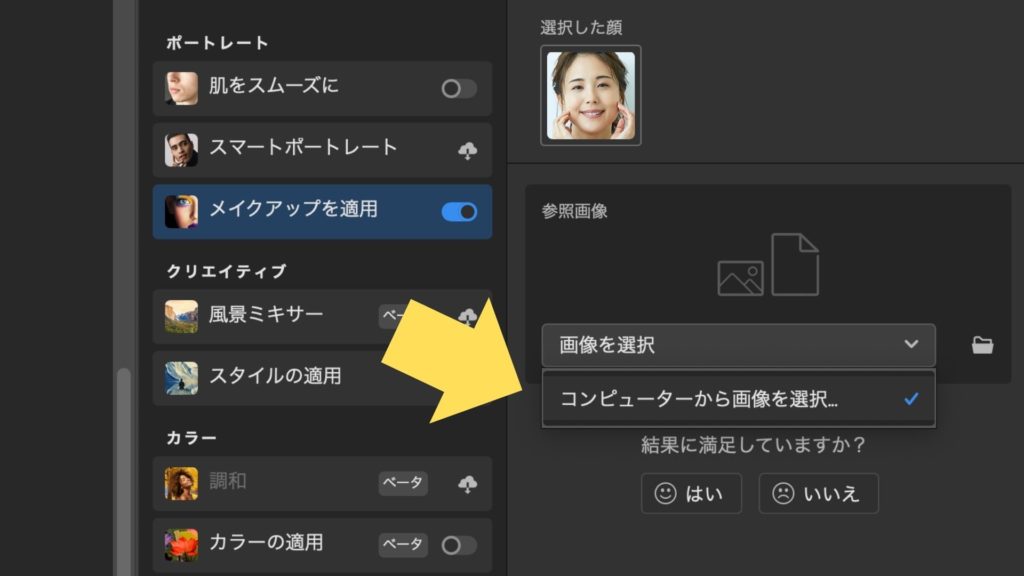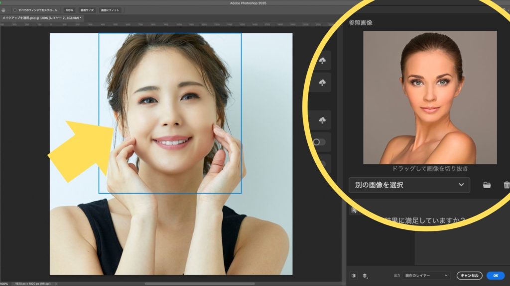 「メイクアップを適用」フィルターをオンにすると、メイクの参照画像を指定するオプションが表示されます。ここで「画像を選択」をクリックし、コンピューターに保存されているメイクを反映させたい参照画像を選択して開きます。参照画像が読み込まれると、PhotoshopのAIが自動的に処理を開始し、ターゲット画像にメイクを適用します。