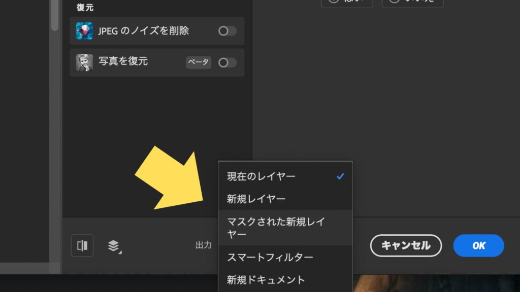 処理が完了したら、結果を画像として出力します。出力形式は、「新規レイヤー」「マスクされたレイヤーを複製」「新規レイヤー」などから選択できます。非破壊編集を可能にするため、「マスクされた新規レイヤー」や「新規レイヤー」での出力が推奨されます。これにより、元の画像を損なうことなく、いつでも編集内容を修正したり元に戻したりできます。
