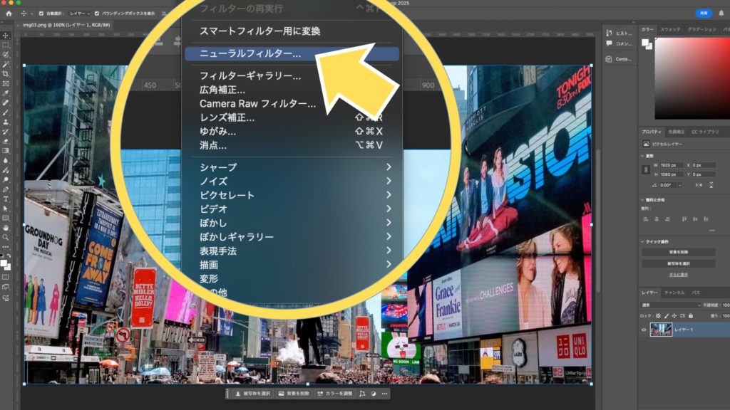 ① ニューラルフィルター画面を開く