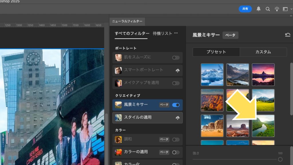 フィルター一覧から「風景ミキサー」を探し、スライドボタンをオンにします。