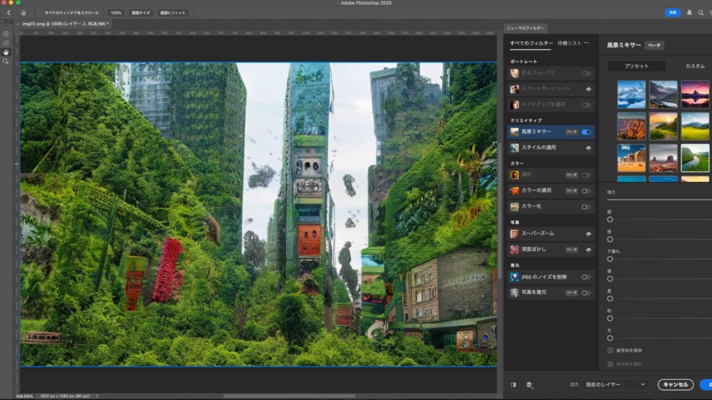 「風景ミキサー」は、PhotoshopのAI機能の中でも特に直感的で使いやすいフィルターです。風景の変更だけでなく、季節や時間帯の演出も可能なので、写真の雰囲気を劇的に変えることができます。