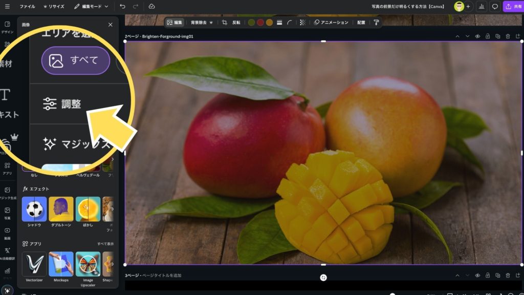 ツールバーから「編集」をクリックすると、画面右側にサイドパネルが開きます。その中にある「調整」を選択してください。