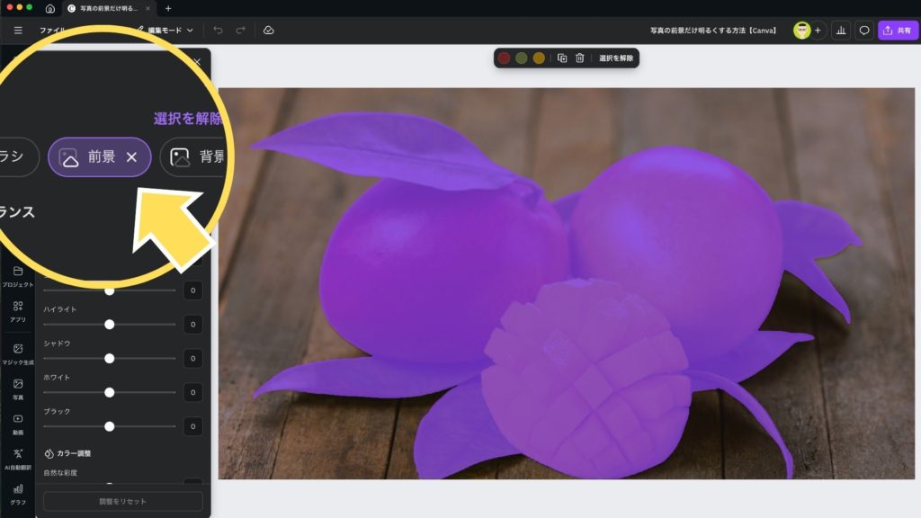 「エリアを選択」という項目が表示されるので、その中から「前景」をクリックします。CanvaのAIが自動で前景を認識してくれるので、手動でマスクをかける必要はありません。
