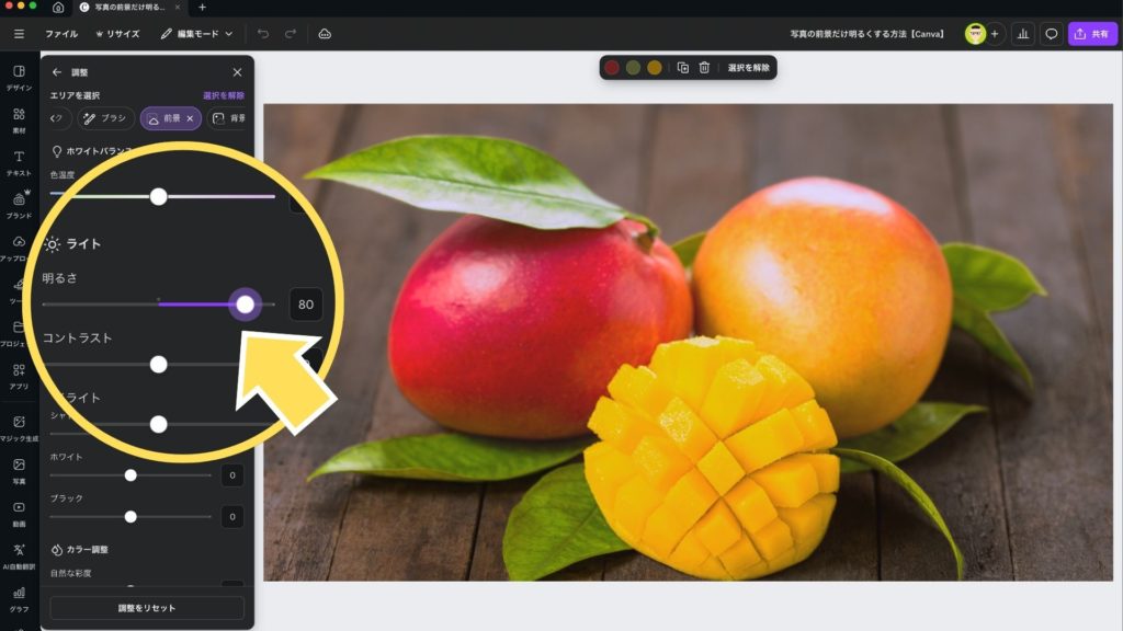 「ライト」セクションにある「明るさ」のスライダーを動かして、前景の明るさを調整します。少し明るくするだけでも、被写体の印象がぐっと引き立ちます。