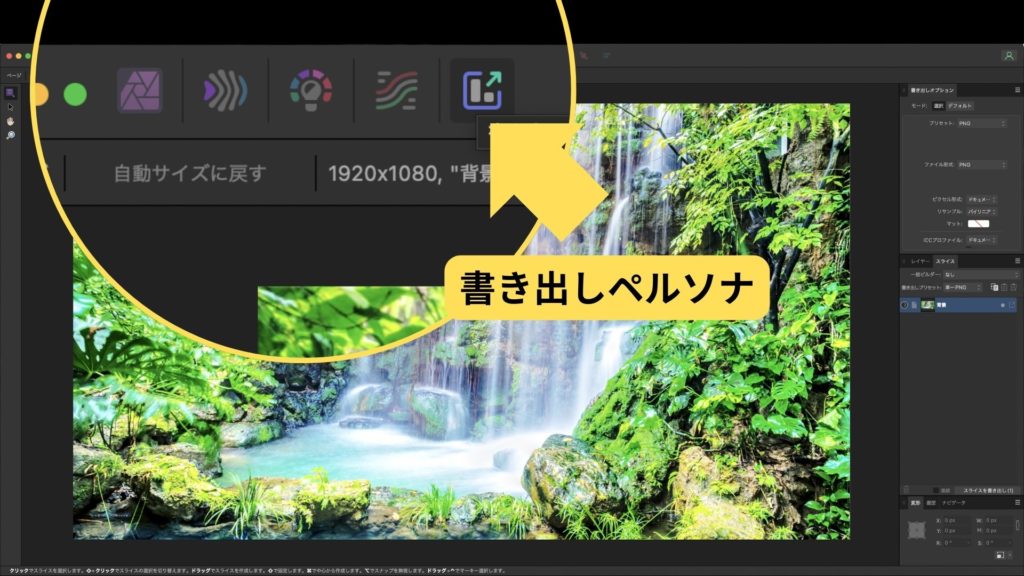 最後の書き出しペルソナは、完成した画像を様々な形式で出力(書き出し)するための専門スペースです。画像全体を書き出すだけでなく、特定のレイヤーだけを個別に、あるいは画像内の一部を「スライス」として切り出して、それぞれ異なるフォーマット(JPEG, PNG, TIFFなど)で一括出力することが可能です。Webサイト制作などで複数の画像パーツを一度に用意したい場合に、絶大な効果を発揮します。