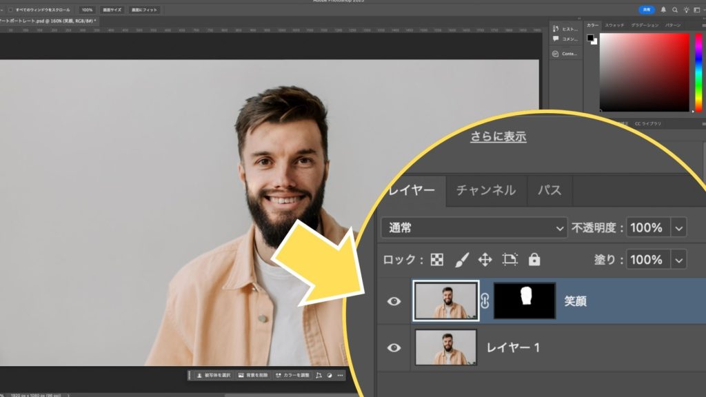 まずは、編集したい人物が写っているレイヤーを選択した状態にしてください。