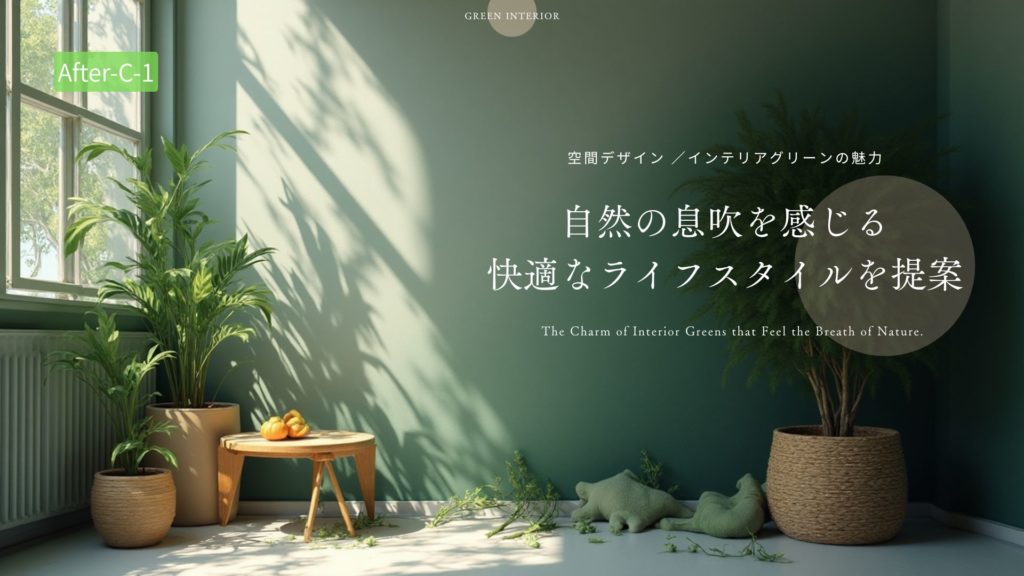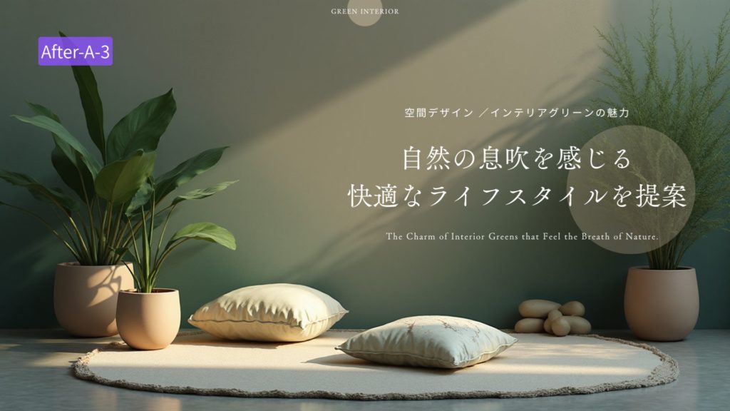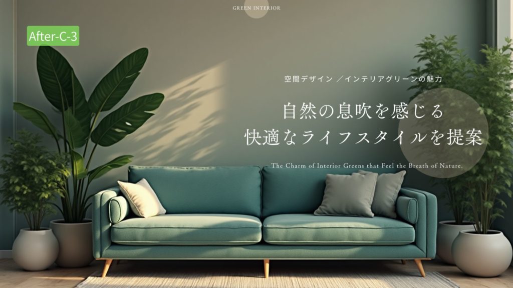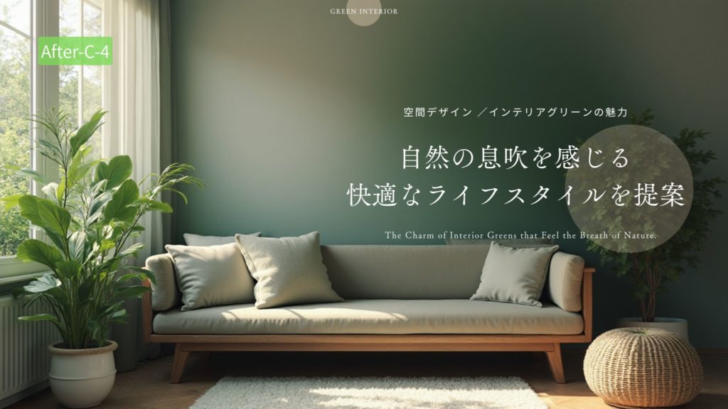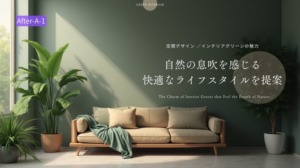 「プロンプト例;自然の息吹を感じさせる、自然な室内緑化を取り入れた快適さと魅力を重視したインテリアデザインとライフスタイルのプロモーション」