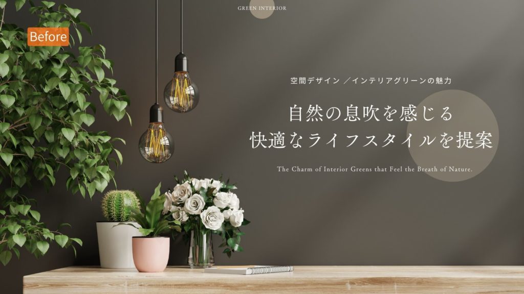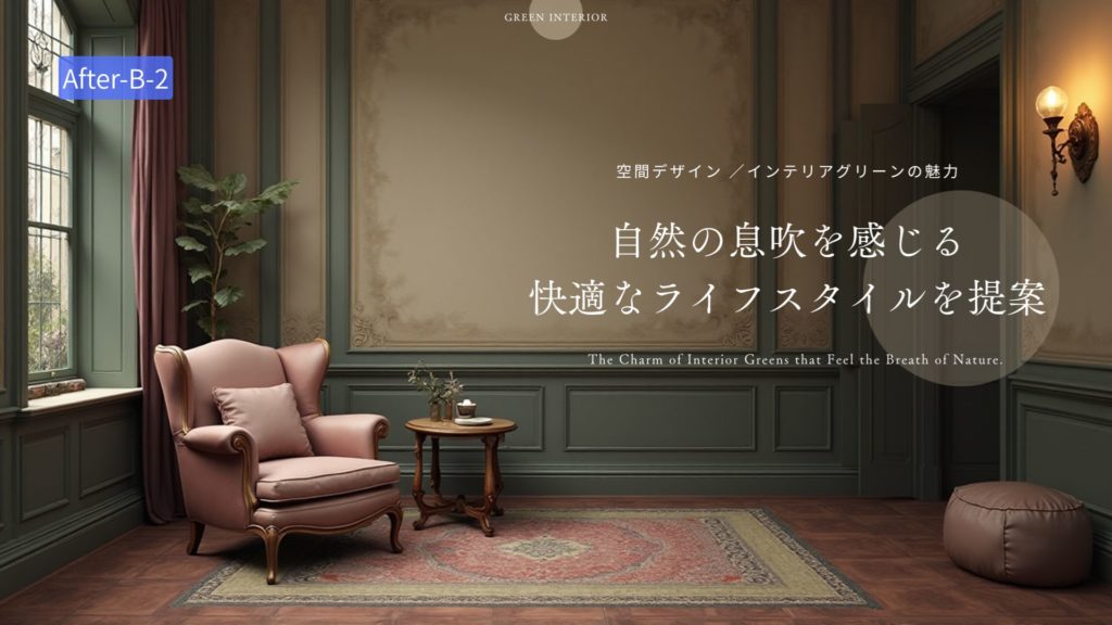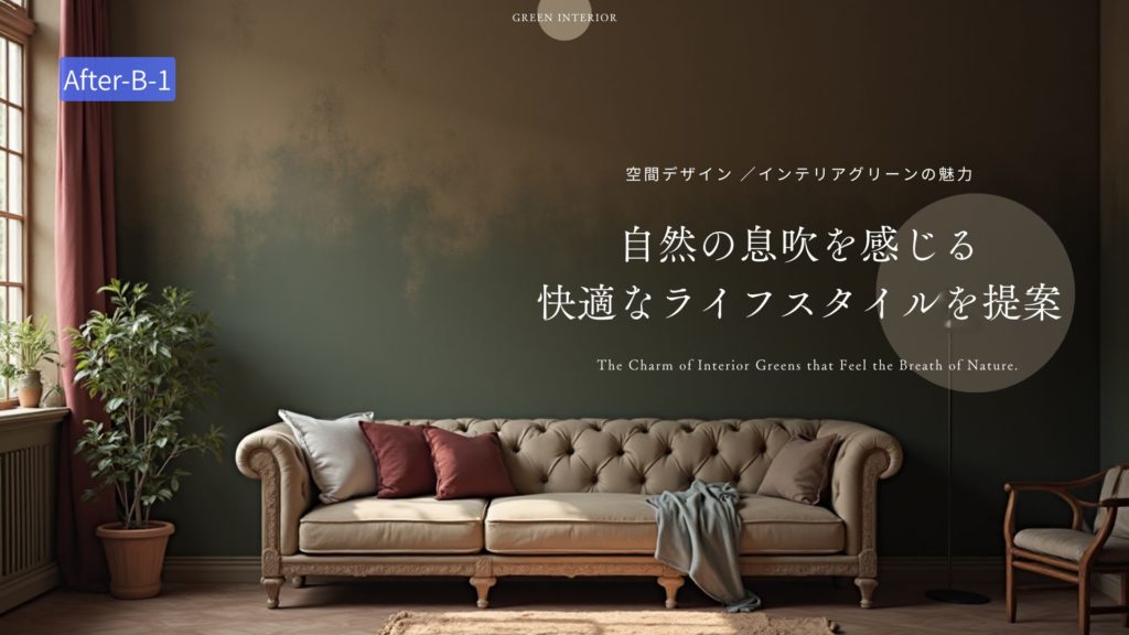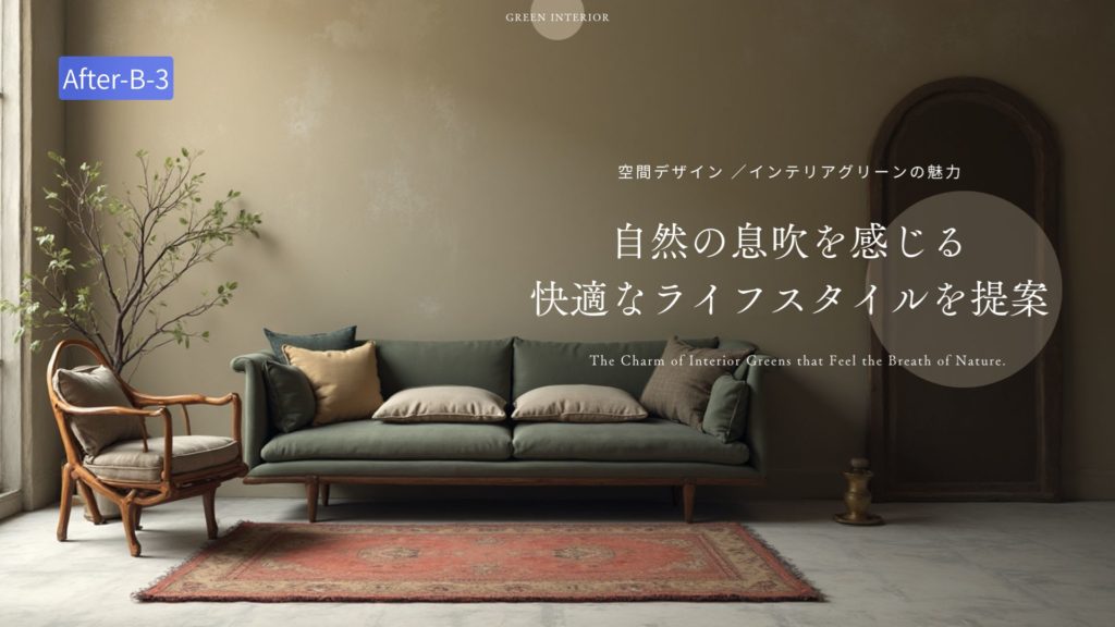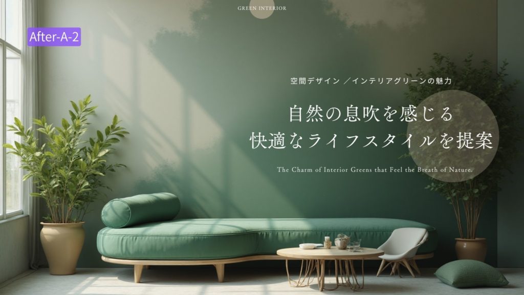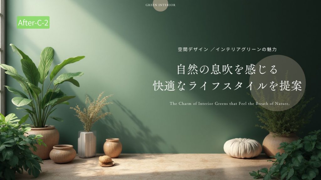 「プロンプト例;自然の息吹を感じさせる、自然な室内緑化を取り入れた快適さと魅力を重視したインテリアデザインとライフスタイルのプロモーション」