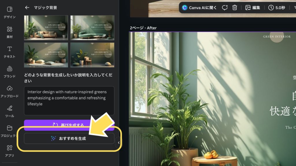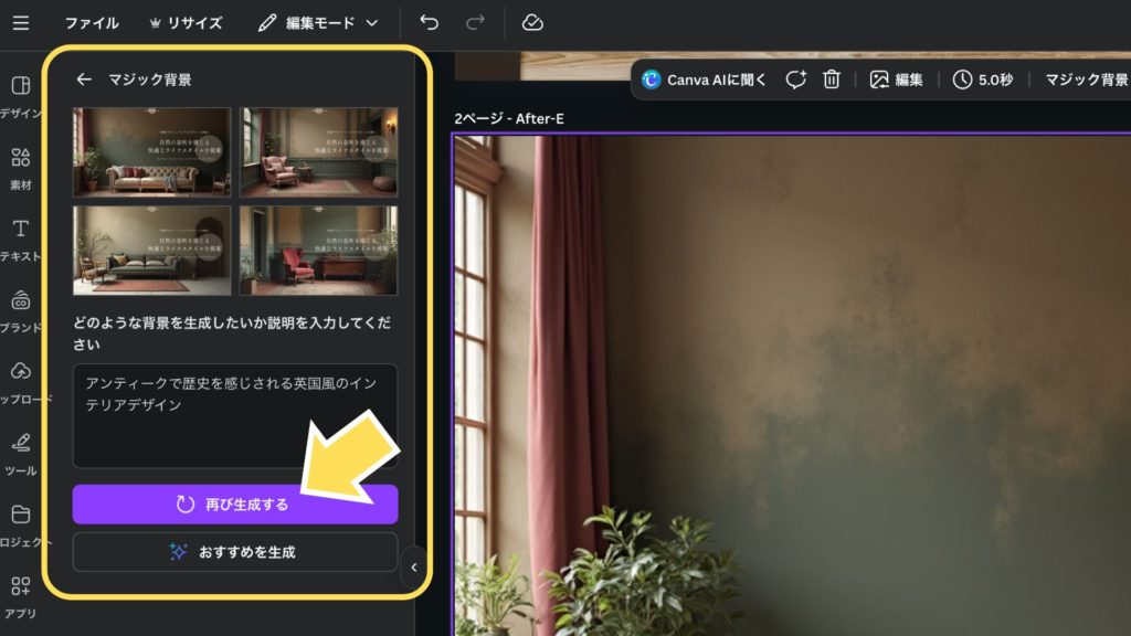 自動生成されたもの以外にも、特定のイメージがある場合は、テキスト入力欄に「どのような背景を生成したいか」の説明を入力し、「再び生成」をクリックします。思い通りの背景を何度でも再作成してくれます。