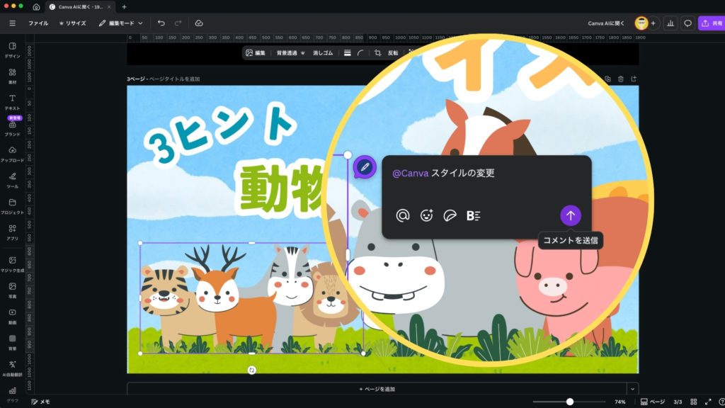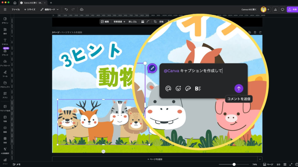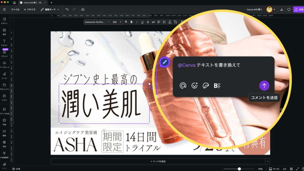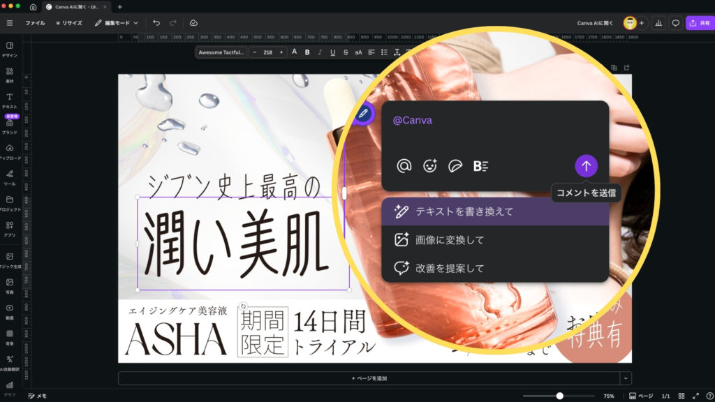 デザインエディタ内で、編集に悩んでいる要素(背景、テキストボックス、挿入した素材など)をクリックすると、ポップアップメニューの中に「Canva AIに聞く」という項目が表示されます。