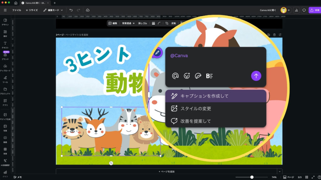 「キャプションを作成して」、「スタイルの変更」、「改善を提案して」の3つの選択肢から選ぶことが出来ます。