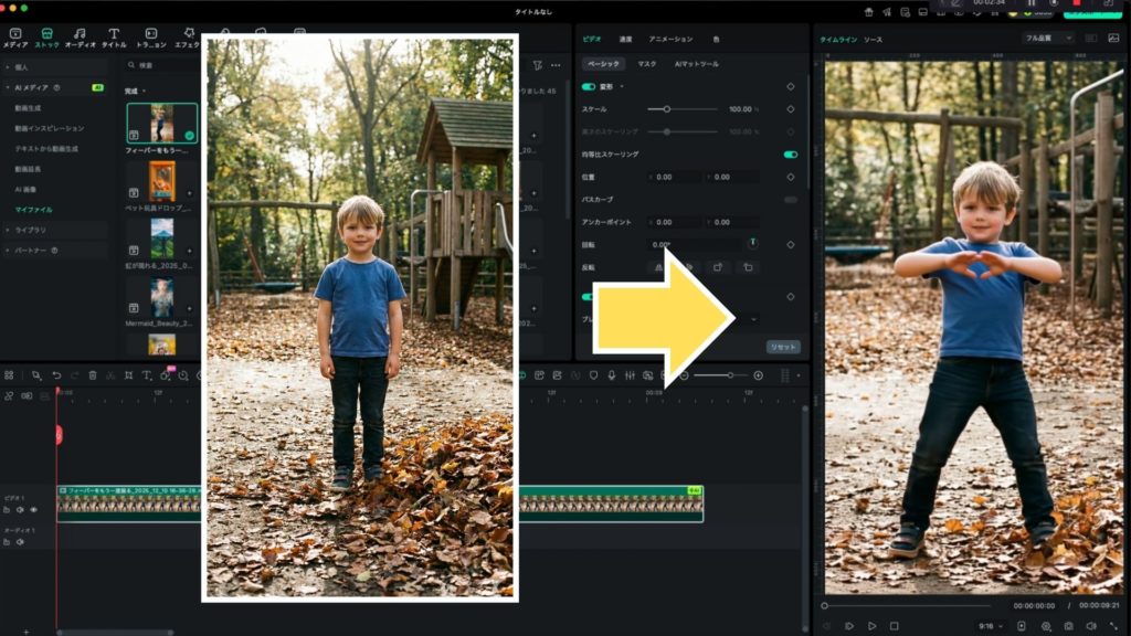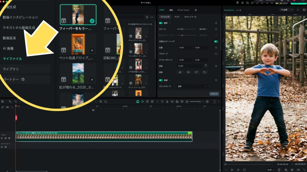 ●生成された動画は「マイファイル」に保存されます。これをタイムラインにドラッグすれば、音楽を入れたりテロップを入れたりといった追加編集も可能です。